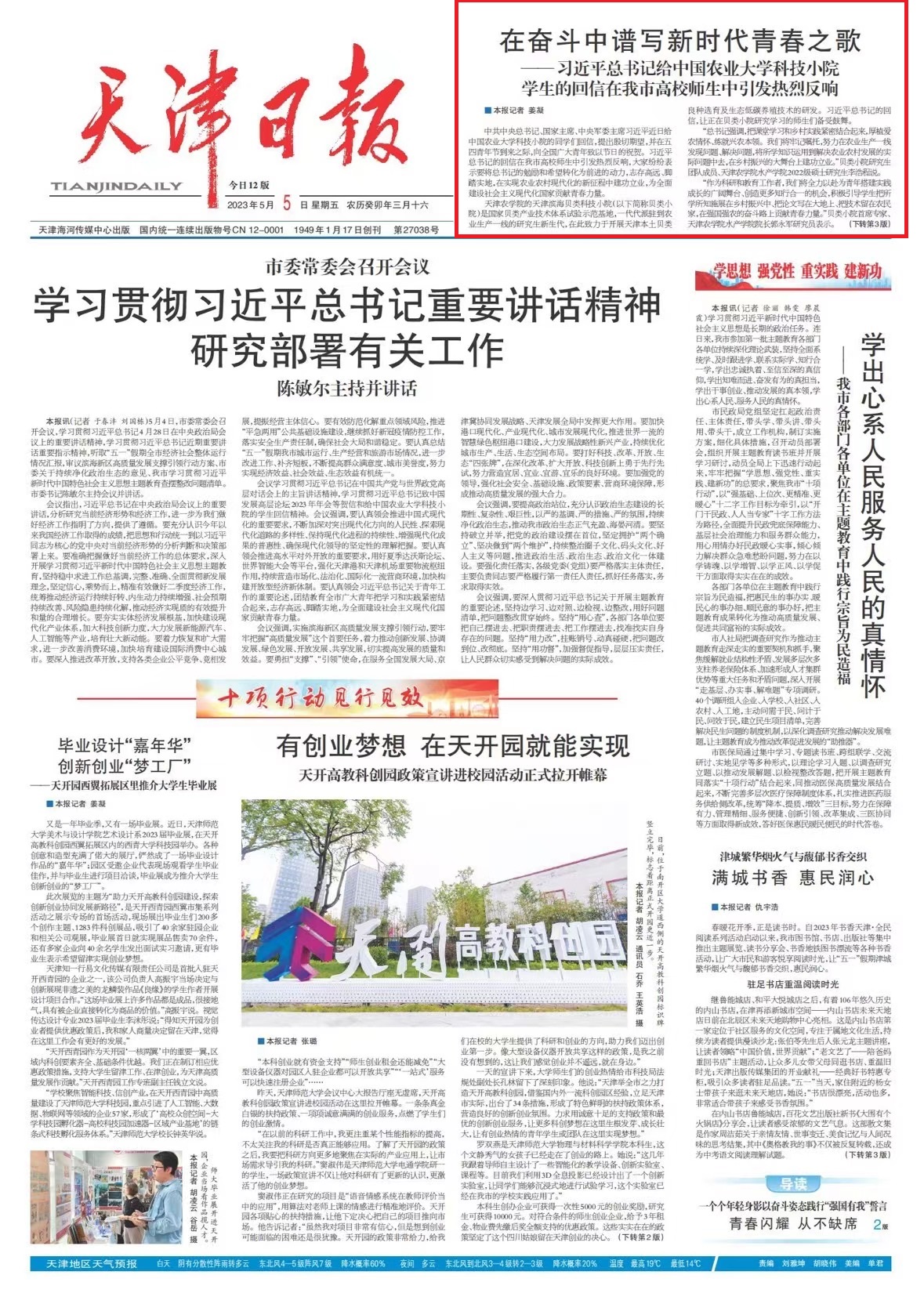 《天津日报》:在奋斗中谱写新时代青春之歌──习近平总书记给中国农业大学科技小院学生的回信在我市高校师生中引发热烈反响
